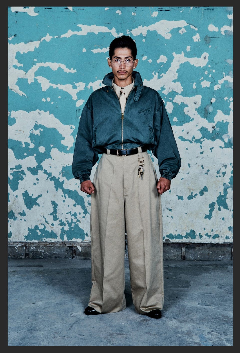 The first look of the show is made up of a mid crop utility jacket in a washed teal blue. On the left front panel the name “Chavarria” is embroidered in elaborate cursive. The collar of the jacket is popped, framing a crisp khaki colored collar and tie. The model’s shirt and tie perfectly match a pair of wide leg trousers that drape nicely between sharp creases and cascade into a full break at the hem. Dangling from a belt loop are a set of keys. The look emulates the uniform typical perhaps of maintenance or custodial workers, and is reminiscent of Pachuco style, particularly the excess fabric of the pants and in the styling of the models hair into a slick pompadour.