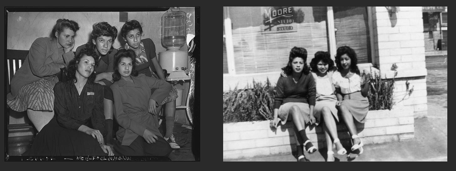 During the war years, opportunities to work were incredibly valuable to Mexican American youth who could suddenly earn meaningful wages and thus have more disposable income to go towards leisure, entertainment, and of course, clothes. As historian Catherine Ramírez observes in her book The Woman in the Zoot Suit: “for many young women and men who came of age in the early 1940s, the zoot suit and its accessories were signs of affluence… allowing a generation that had been forced to wear ‘welfare clothes’ during the Great Depression to take pleasure in appearance” (Ramírez 59). The zoot suit, which originated with Black youth on the East Coast in the jive and jazz scene, included large billowing pants that taper at the ankle and a long fingertip coat, which were worn by both men and women (Ramírez 4, 88). Women who wore the suit might opt to wear a knee length skirt – dangerously short at the time – in addition to the coat, with hair teased into beehive shapes and excessive makeup. Within a Mexican-American context, the Zoot Suit became a symbol of youth subculture that signified earned wealth and social mobility. While Pachucas and Pachucos might have been admired by their peers for their “buenas garras” (“cool threads”) and “spirit of adventure,” they were widely criticized by other Mexicans and whites, who read their style of dress and indulgence in leisure as excessive and unproductive.