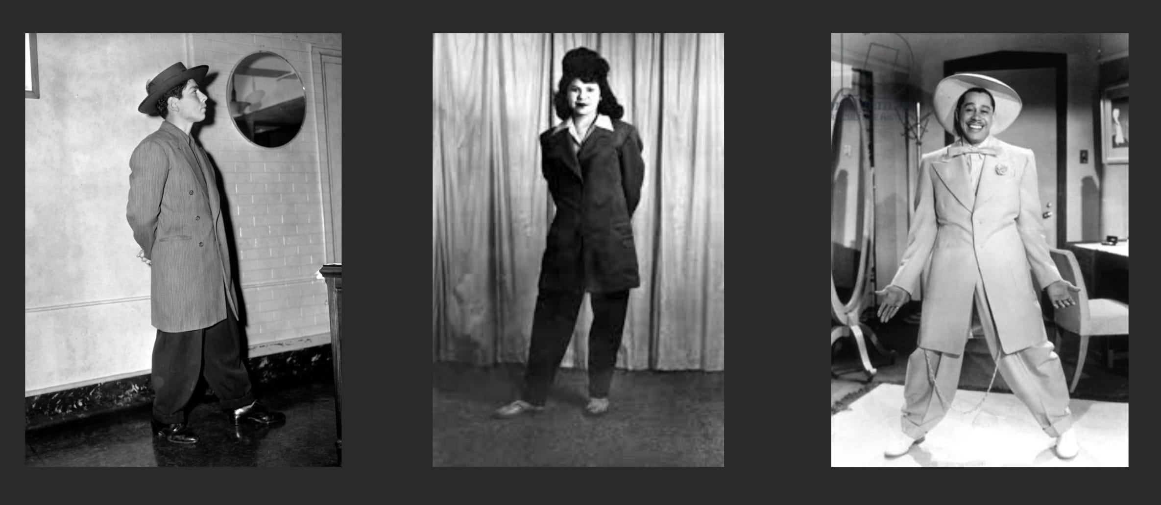 While generally, Pachuca women wore both the skirt and pant version of the suit, both options carried with them different gendered and sexed connotations. If it wasn’t actual skin that was exposed by a shorter skirt, then it was the all too curvaceous silhouette the clothing accentuated that was appalling to both traditional Mexican and American sensibilities. The aesthetic excess of the Pachuca is not necessarily located in her clothing but rather in the assumption of hypersexuality as a woman who dresses in hyper-feminine style for her own embodied and aesthetic pleasure and occupies public space away from the protection and watchful eye of parents at home. For women who wore the men’s version of the suit – the long fingertip coat and billowing pants – they achieved a different kind of aesthetic excess through more masculine performances of race and gender. The pant version of the suit gave women a noticeably more masculine silhouette, upsetting gender presentation rules, and expectations by transgressing across the gender binary. Thus, by wearing the garments of her male, gang-oriented counterpart, the Pachuca in the zoot suit moved herself in closer proximity to criminality and violence. These false assumptions lead outside members to fear the woman in the zoot suit who not only dressed like a man but acted like one too. But what do we make of the man who dresses and acts like a woman?