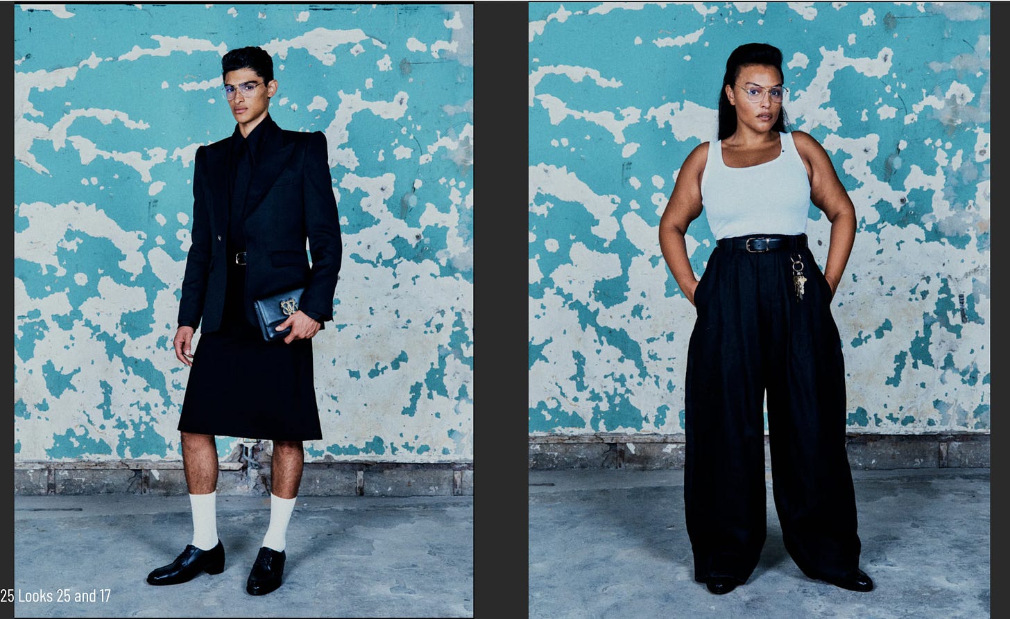 As I mentioned previously, young Mexican Americans in the 40s often had to save in order to afford a zoot suit. Owning one became a symbol of pride that demonstrated work ethnic and at the same time suggested an unwillingness to accept social marginalization. Ramirez notes that Pachucas and Pachucos who flaunted their disposable incomes underscored the instability of class and race categories by refusing to stay in their social and/or physical space (61). While I agree with Ramirez on this front, I would add that the suit also destabilized gender categories, which we see in these two designs. In the first, a male model wears a slim fitting long jacket with rounded shoulder pads. Beneath, is a black shirt and tie tucked into a knee length black skirt with a subtle A-line design. The model is also carrying a black leather clutch. In the second look, supermodel Paloma Elsesser wears a tight white tank top tucked into dark high waisted trousers. They have a similar silhouette to the pants in the first look and are accessorized with the same set of keys.