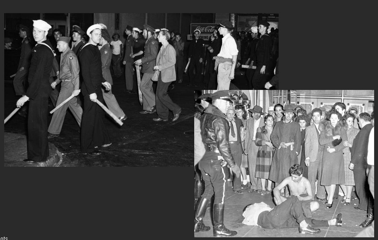 To answer this, I’d like to turn back to the Zoot Suit Riots, where Mexican men and zoot suitors were publicly stripped of their clothing. Scholar Mauricio Mazón suggests that this violence sought to symbolically castrate Mexican men whose investment in style and personal adornment had already marked them as feminine. By publicly humiliating and de-sexualizikng these men of color, white men were able to affirm their superiority and power within a broader social and sexual landscape. Ramírez notes that sex and sexuality were certainly important factors in the riots as some newspapers at the time claimed the brawl started after a gang of Pachucos had abducted two white women and sexually assaulted them. However, Ramirez tells us that other newspapers suggested that the violence erupted because white men were frustrated that they did not have sexual access to Mexican American women, and at least one paper suggested it was because white men were fed up with “loose girls of the Los Angeles Mexican quarter” who took advantage of unsuspecting sailors with pockets full of money. And so because there are a few different possibilities of who was denied sex, who had weaponized sex, and who had an appetite for sex – I think it’s likely that sex was not the only thing considered when deciding to rip the clothes off these young men’s bodies. I read this violent act as an attempt to strip the humanity of these men by destroying what had become a symbol of pride and source of embodied pleasure. I imagine the suit allowed these men to cultivate a relationship with their bodies and sense of self that was not oriented around productivity or capacity but rather quite simply the gratification of wearing something you like. Put differently, I think the suit allowed these men to understand themselves as beautiful and made the desire to be seen safe enough to explore. In her writing on Black Dandyism professor of Africana studies Monica Miller theorizes that the space between skin and uniform is what transforms the body from a cliché to an interrogation (Miller 245). These white sailors sought to reinscribe the cliché notions that Mexicans are ugly, other, and only good for work by taking away the clothing that invited and allowed both men and women to explore their bodies in non-productive pleasure focused ways.